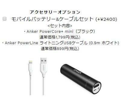 充電器は付属していないが、オプションでAnkerのモバイルバッテリー&ケーブルセットを通常よりも割安で購入できる。