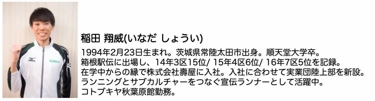 1994年2月23日生まれ。茨城県常陸太田市出身。順天堂大学卒。箱根駅伝に出場し、14年3区15位/ 15年4区6位/ 16年7区5位を記録。在学中からの縁で株式会社壽屋に入社。入社に合わせて実業団陸上部を新設。ランニングとサブカルチャーをつなぐ宣伝ランナーとして活躍中。コトブキヤ秋葉原館勤務。