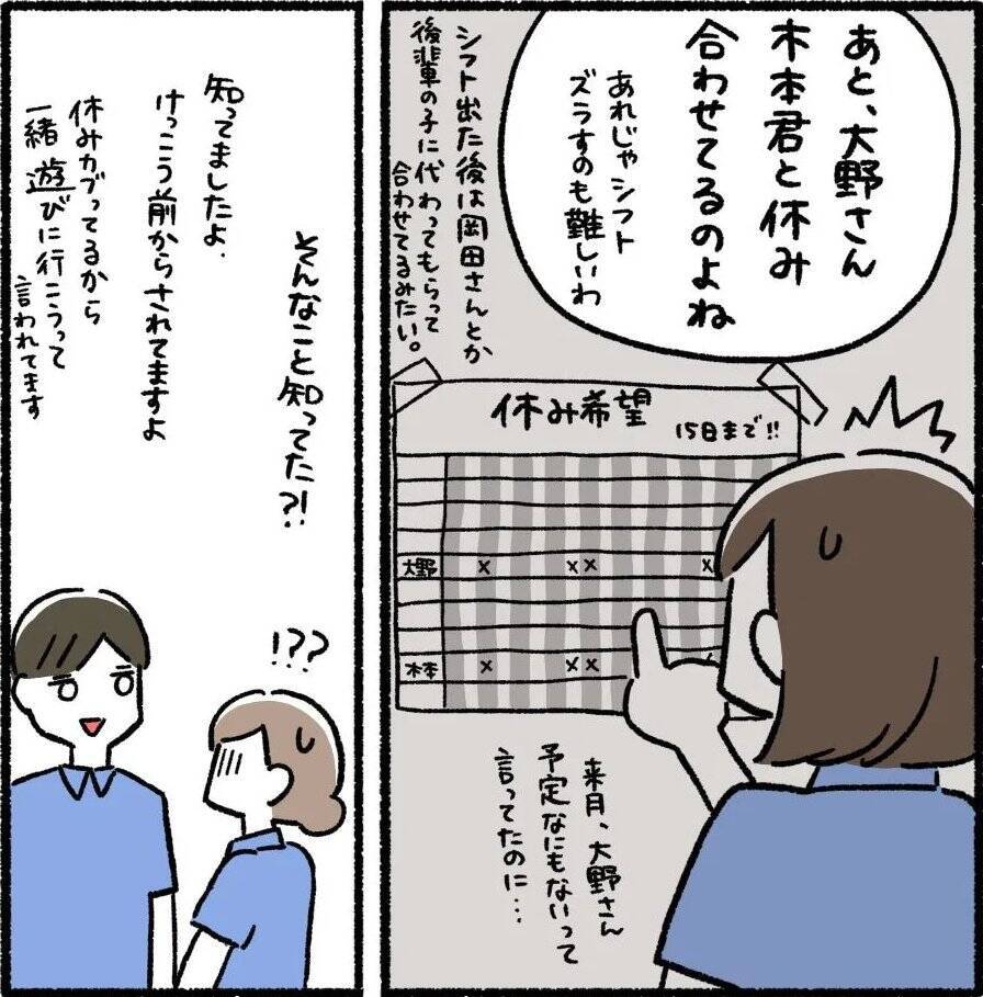 仕事中も新人君にべったりの大野さんは、バイトリーダーの