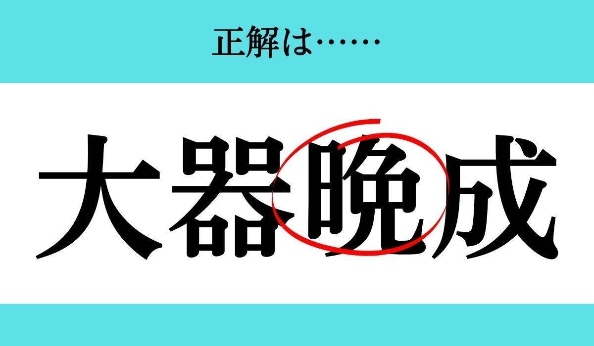 □に入る漢字は「晩」、正解の四文字熟語は「大器晩成」でした!