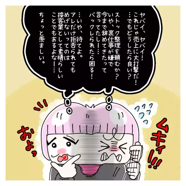ゆき蔵さんがアパレル業界で働いた時に経験した女社会の闇深さを漫画化。若井さんが接客すると、お客様がドン引きしてお店を去って行ってしまう。そんなことが何度もあり、ゆき蔵さんはオロオロしていた。1話から2...