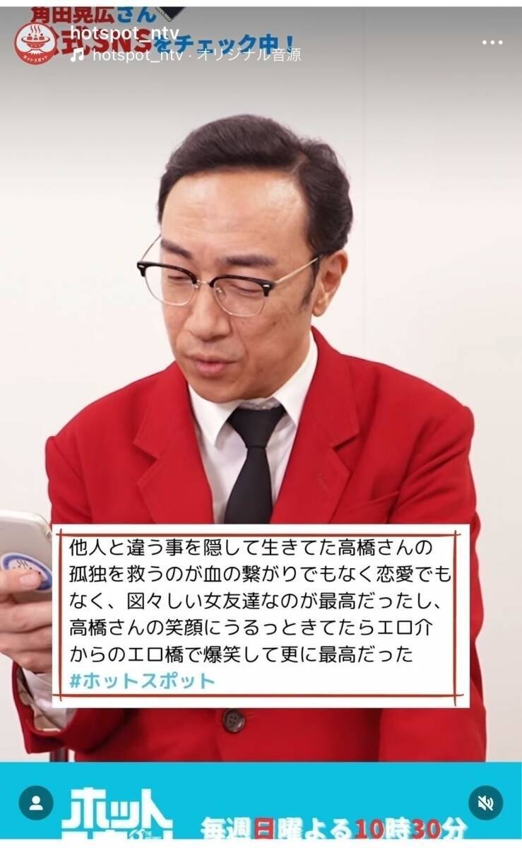 ドラマ『ホットスポット』の公式インスタグラムが8日に更新され、主演の東京03・角田晃広が視聴者から寄せられたSNSコメントを読み上げる動画が投稿された。