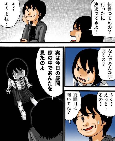 鏡が割れてから奇妙な出来事が起きる。学校に行っていたにも関わらず母からは「昼間家で見たのよ」そして妹には…。