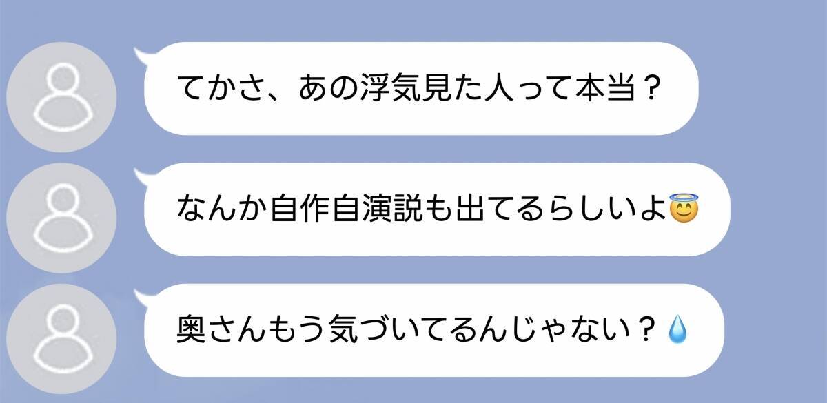 またLIMEに投稿があった。画面を見た瞬間、心臓を掴まれたような感覚が襲ってきた。(……私のことだ)“橘陽菜さんの旦那さんらしき男性と知らない女性を見かけた”と話したのは私。でも今、投稿では私自身が“...