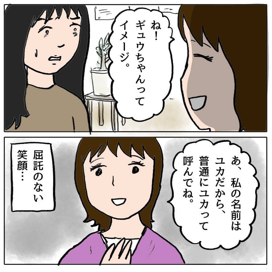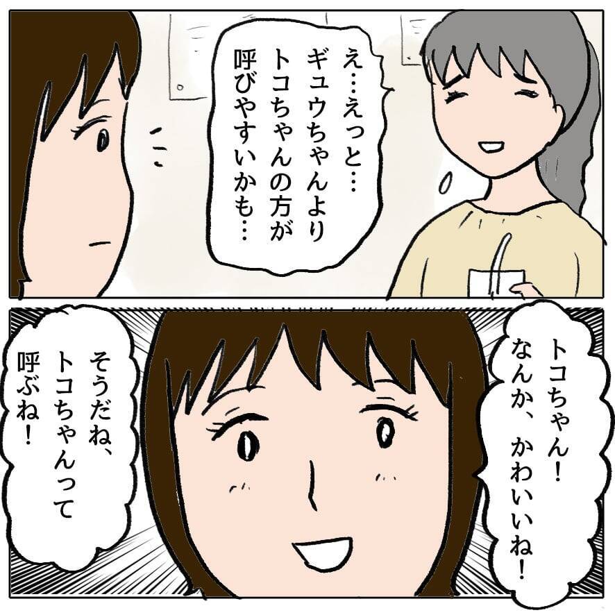 みんな下の名前で呼び合うことになったのに、ハナちゃんママに対してはノリちゃんママが「ギュウちゃんね」と名字を音読みしたあだ名を与える。
