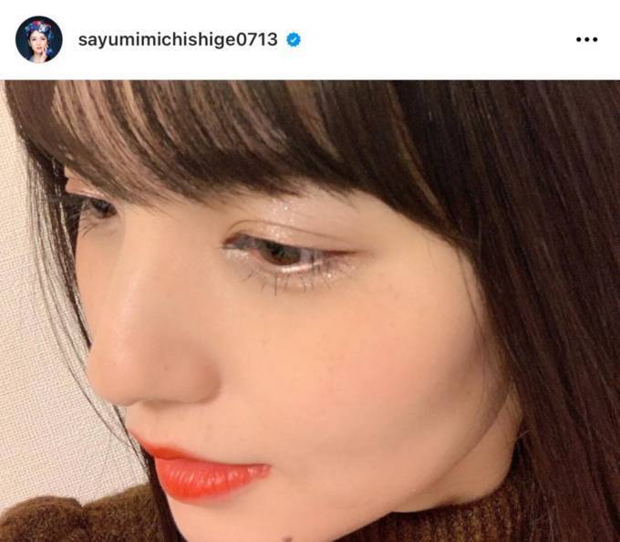 道重は自身のInstagramにて、「ONE PIECEコラボのクリスマスコフレ使ってメイクしました」「アイシャドウのキラキラ感テンション上がる」「リップの色も可愛すぎてます!」とコスメの使用感などを綴り、色づきの良いリップやラメ感のあるアイシャドウを使用した、顔アップの写真を公開。