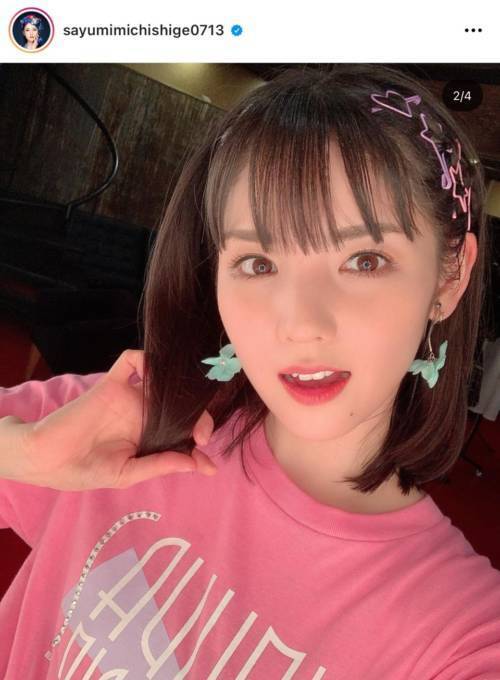 道重は自身のInstagramアカウントにて「自撮り」といったコメントと共に、ボブヘアをカラフルなピンでまとめたアレンジスタイルや、ピンクのTシャツに蝶柄の白いスカートを合わせたコーディネートを公開。