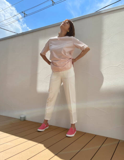 また、hitomiは前日の3日にもブログを更新しており、こちらでは「お家時間、楽しくオシャレに…」とタイトルに綴ると、「Tシャツコーディネート ラクが一番」「ストレッチ感のあるホワイトパンツ サラっと履けてちょうどいいー」「オンオフとわず履ける 楽ちんさ」「夏に向けて1本あると 便利です。」と淡いピンクのTシャツに白いパンツとピンクのスリッポンを合わせたコーディネートも披露していた。