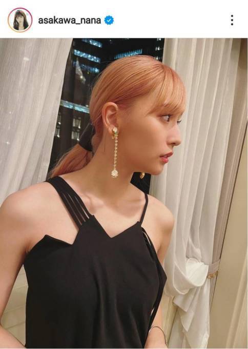 7月21日、浅川梨奈がInstagramを更新。髪をピンクカラーに染めた、美しいデコルテが際立つドレスSHOTを公開した。