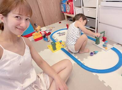 辻は、自身のブログを「暑過ぎて」というタイトルで更新すると、「薄着に限る!!!!!!!!!!!!」とコメントしてナチュラルな雰囲気な薄着の自身とプラレールで遊んでいる三男の写真を公開。