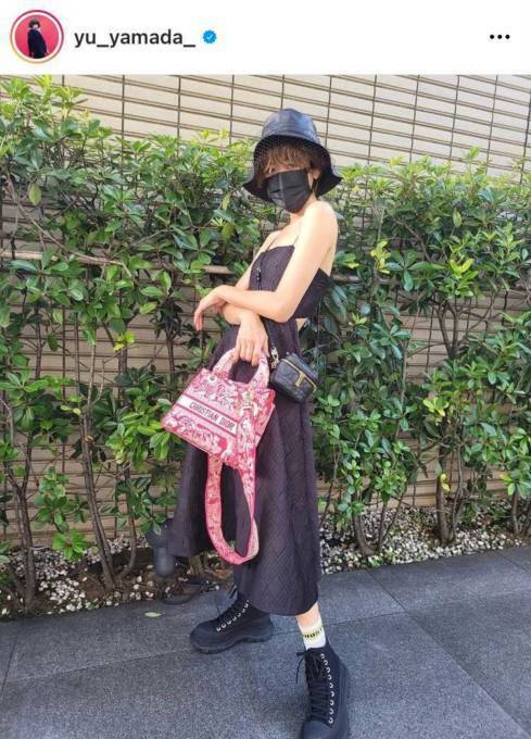 山田は、自身のInstagramアカウントにて、「@pasand_by_nequittezpas と @rena_semba のコラボワンピース」「ボリューム感、肌見せ感、最高です」「#outfit #bag #hat #socks @dior #shoes @alexandermcqueen #onepiece @pasand_by_nequittezpas @rena_semba」「オールブラックコーデ」とコメントやハッシュタグで綴り、ワンピース、ハット、シューズをオールブラックでまとめ、赤いディオールのバッグを差し色にしたコーディネートを披露した。