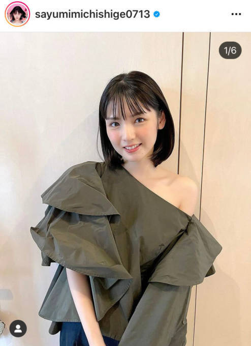 道重は、自身のInstagramアカウントにて、「#MAQUIA」「#MAQUIA10月号」「#発売中」「#オフショット」「掲載していただいています」といったコメントやタグと共に、カーキ色のワンショルトップスを着用した、撮影オフショットを複数公開。