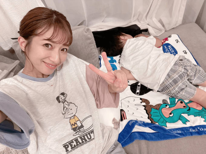 そんな辻は、同日別の投稿では、スヌーピーの柄がプリントされたTシャツを着用し、寝ている三男と撮影したツーショットも披露していた。
