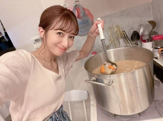 そして、「大量豚汁を作りました」「デカデカ鍋 我が家にはなかなか無い 次の日の豚汁」「これならいけるな!!!!!!!!」とコメントし、豚汁が入った大きな鍋の前で笑顔を見せている自撮り写真も掲載した。