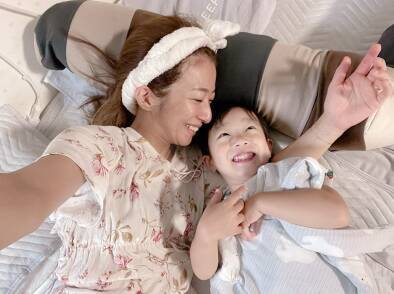 辻は、自身のブログを「午前中は▽」というタイトルで更新すると、「休日の午前中は朝ごはん食べて 洗濯終わるまでまた布団でゴロゴロ」と綴り、三男と2人で寝転んでくつろいでいる写真を公開。
