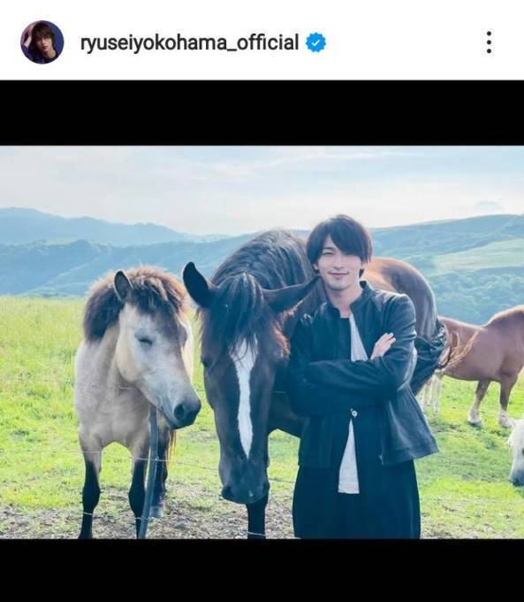 同時に、自然豊かなロケーションの中で、うっすらとしたヒゲ姿の横浜が動物と寄り添っている写真や、ラフなファッションの全身ショット、共演者らとの3ショットを公開した。