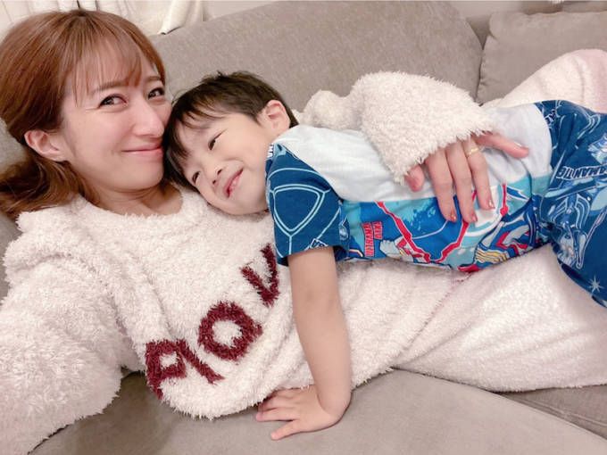辻は、「おやすみ」というタイトルでブログを更新すると、続けて「なさい」と綴り、ソファーに寝転びながら笑顔で三男を抱きしめている2ショットを掲載。