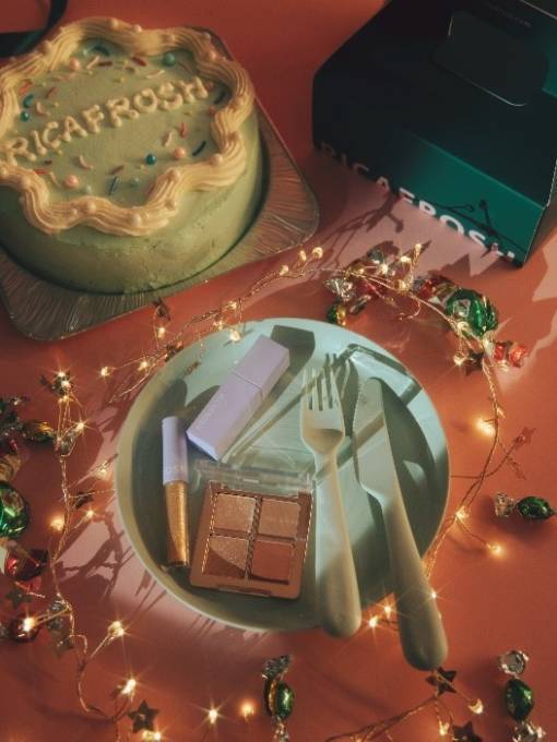 冬らしいウォームカラーのアイテムや大粒のグリッターラメとリップティント等、限定版を含む3アイテムをオリジナルケーキボックスに詰め込んだ。