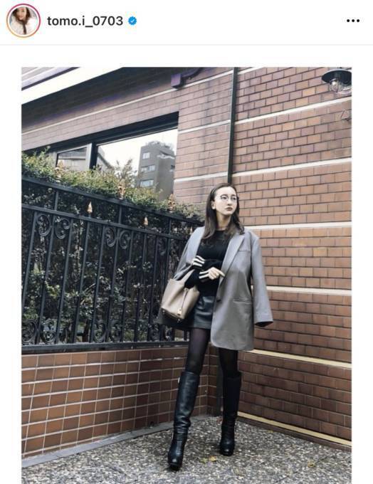 板野は、自身のInstagramアカウントにて「Today’s outfit.」とコメントすると、グレーのジャケットを肩から羽織り、ミニスカートにブーツを合わせたコーディネートを公開。