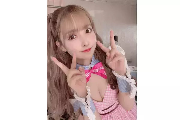 三上はTwitterを更新。ふっくら谷間が目を引く、ブルーとピンクチェックのメイド風衣装姿の写真を公開した。