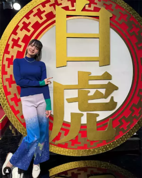 岡田は17日、「先日の極雀DEポンの衣装 8時間も真剣勝負できて本当に楽しかったなぁ」とInstagramを更新。ブルーのニットに、グラデーションが目を引くパンツ姿の衣装ショットを公開した。