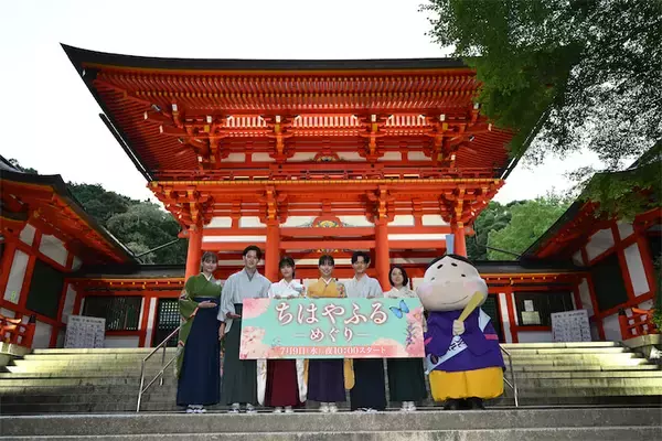 夕刻にはライトアップ点灯式にも登場。主演する當真の「『ちはやふる-めぐり-』、大ヒットを願って」との掛け声のあと、全員で「3、2、1」とカウントダウンし、境内に光を灯した。映画シリーズにも登場する門がライトアップされた様子を見上げ、一同は歓声をあげた。