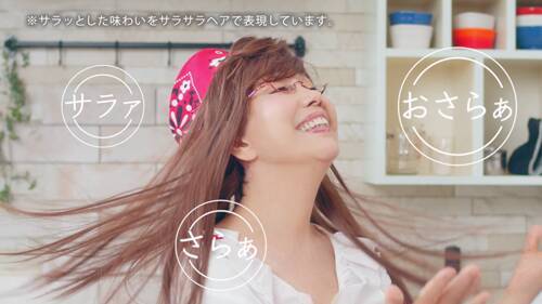 動画では、料理愛好家・平野レミが「十勝のむヨーグルト」を一口飲むと、突然「サラサラロングヘアー」に変身。