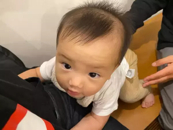 他にも「隣の席にいる方のパソコンを見つめる」息子の写真や、「机に手を置いて、お尻を浮かせて立とうとします。もちろん抱っこ紐や手で支えていますが ここ最近の成長がすごい!!!」と嬉しそうに息子の成長をつづった。