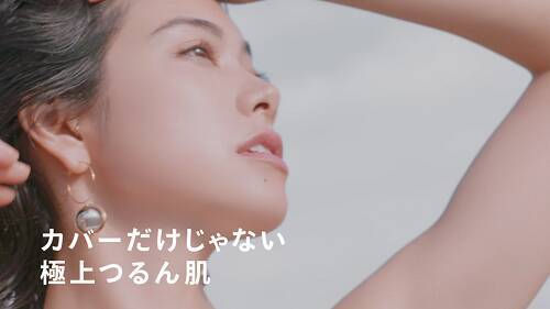 何もない砂漠の広い背景と森の緊張感のある佇まいから始まる、新リキッドファンデの革新性を表現した本CM。真っ白なロングドレスに身を包み、自信に満ち溢れた美しい表情の森の“つるん”としたつやのある美肌に、ぜひ注目を!