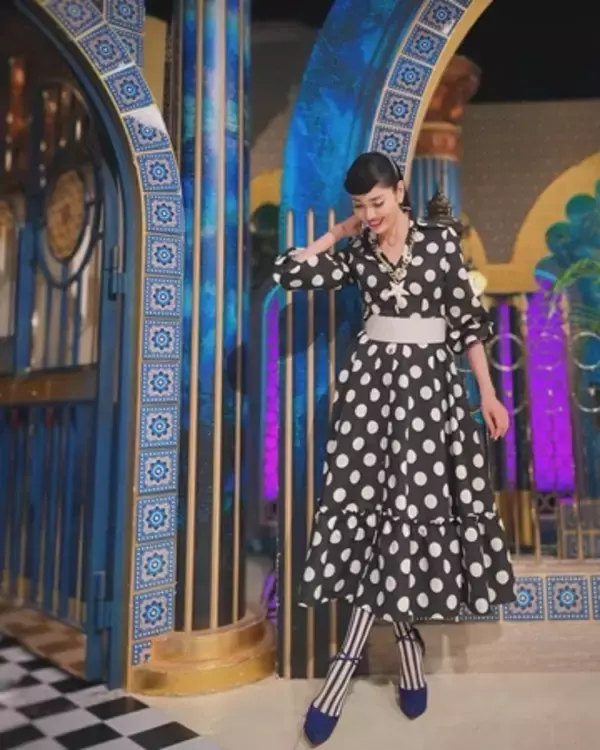 さらに、自身の衣装について「50’sをイメージして、大きめドットのワンピにストライプタイツを合わせて!」とドラマチックなドット柄のマキシ丈ワンピースに太めのベルトを合わせ、ストライプ柄のタイツ、ブルーのハイヒールを合わせたレトロ風なコーデを公開。「ワンピース @reginaromantico」「ベルト @livianacontiofficial」「靴 @zara」「ネックレス @abiste_official」「ピアス @bananarepublic」と着用アイテムを説明した。