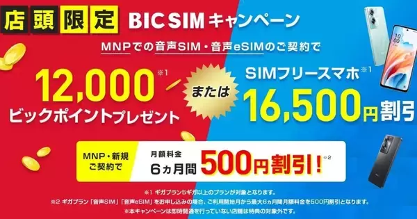 ビックカメラグループが提供するMVNOサービス「BIC SIM powered by IIJ」は9月1日、ビックカメラグループの店頭でSIMフリースマートフォンとBIC SIMを同時契約すると16,500円が割り引かれる「SIMフリースマホ16,500円割引キャンペーン」を開始した。あわせて、ビックポイントが12,000ポイント還元される「ポイント還元キャンペーン」も実施する。