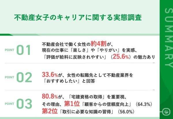 今回の調査では、不動産業界は性別に関係なく実力で評価される環境である他、資格を活かしやすく、未経験からチャレンジしやすいことが明らかになりました。