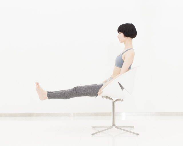 (1)背筋をまっすぐ伸ばして浅く椅子に座り、両脚を前方にまっすぐ伸ばす