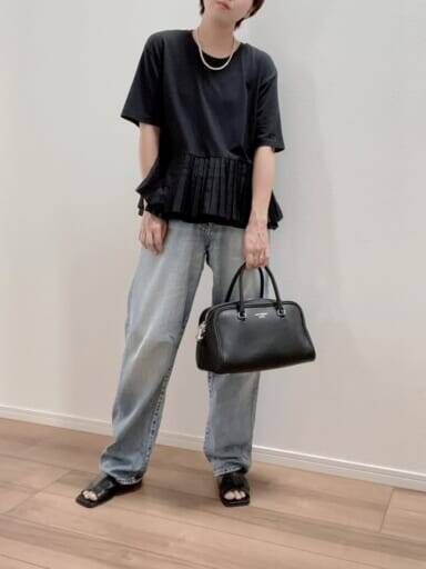 ワンツーコーデも洗練された印象に仕上がるオールブラックコーデ。一方で気温が高い日のオール黒は重たく見えがちですが、プリーツが施されたトップスなら軽快なムードに仕上がります。