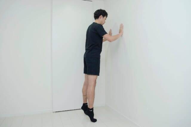 (1)両脚を肩幅に開き、両手をぴったりと壁につけ、やや前傾姿勢になる