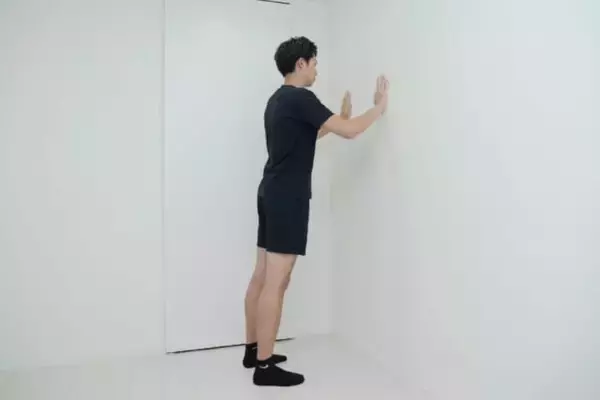 (1)両脚を肩幅に開き、両手をぴったりと壁につけ、やや前傾姿勢になる