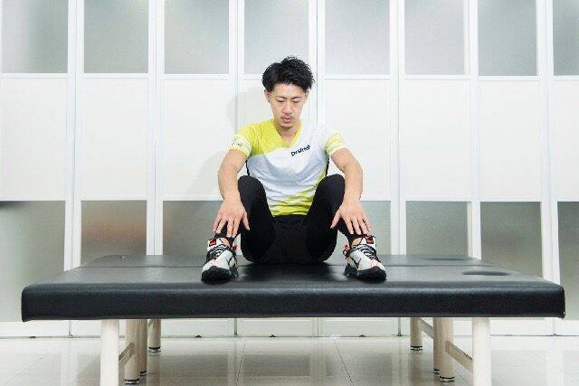 (1)体育座りの姿勢から脚を広めに開く