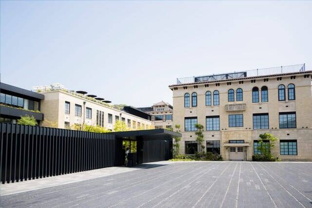 築90年になる小学校の歴史ある建物を最大限残し、新たに増築された箇所は影のように黒く色分けされています。ガーデンの一角には、ミシュランの星付きレストランを展開するアラン・デュカスが設立したデュカス・パリ監修によるフレンチレストラン「ブノワ 京都」があります。