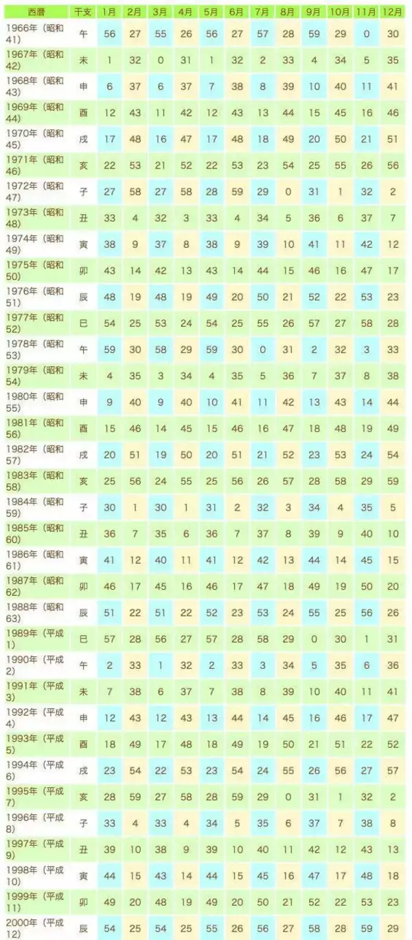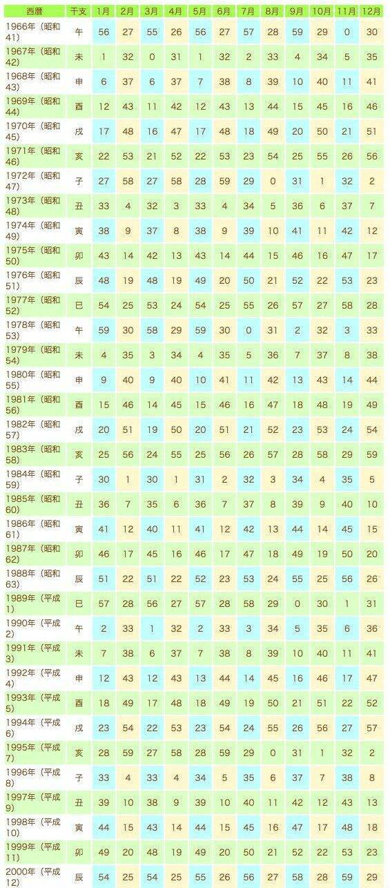まず下の表から「生まれた年」と「生まれた月」の交わるところを確認し、その数字に「生まれた日」を足してください。 ※61を超えたら、60を引く