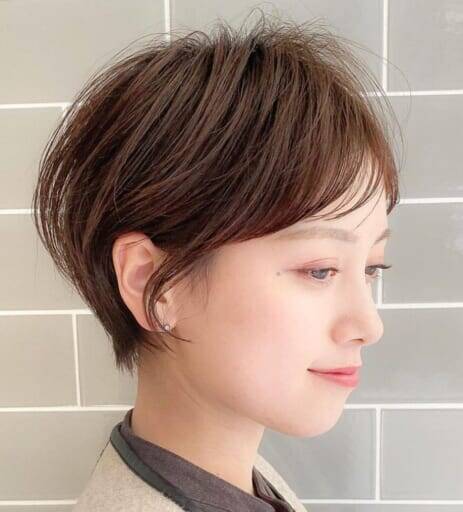 丸みショートは、「短いという印象を出したくない」、「ほんのり可愛さを演出したい」という方におすすめ。なお、どうしても幼見えしやすいスタイルでもあるので、前髪を長めに残すことで甘さの中にほんのり大人な雰囲気をプラスして見た目のバランスを取るようにしましょう。