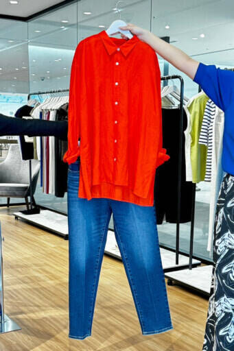 2つ目が、定番のシャツ×デニムスタイルが新鮮な印象に仕上がるトマトレッドのリネンシャツとインディゴデニムとの合わせ。