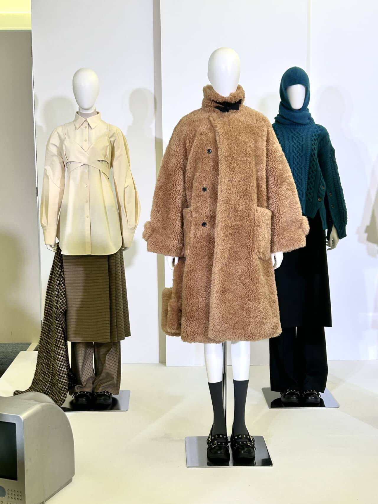 ▲左から、ビスチェコンビネーションシャツ by rokh ¥3,990、2ピーススカートパンツ by rokh ¥4,990、ヘアリーストール by rokh ¥2,990、ファーリーコート by rokh +X ¥7,990、ケーブルセーター by rokh ¥4,990、フードマフラー by rokh ¥1,990