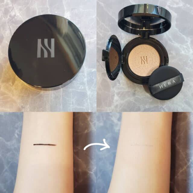▲HERA「ブラッククッションファンデーション」 全7色(写真は21C1) 各¥6,380(税込)。下写真のようにウォータープルーフのアイラインをしっかりカバーできます