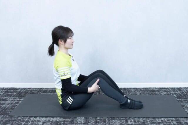 (1)両ひざを立て背筋を伸ばして座り、両手をひざ裏に添える