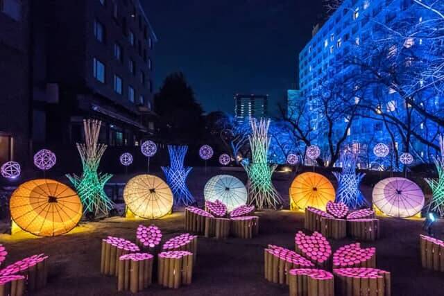 桜の花びらをイメージした竹あかりが様々な色に優しく光ります。数量限定ですが “竹あかり提灯” のレンタルもあって、センサーのある台に置くと、特別な音楽と光の演出を楽しめます。