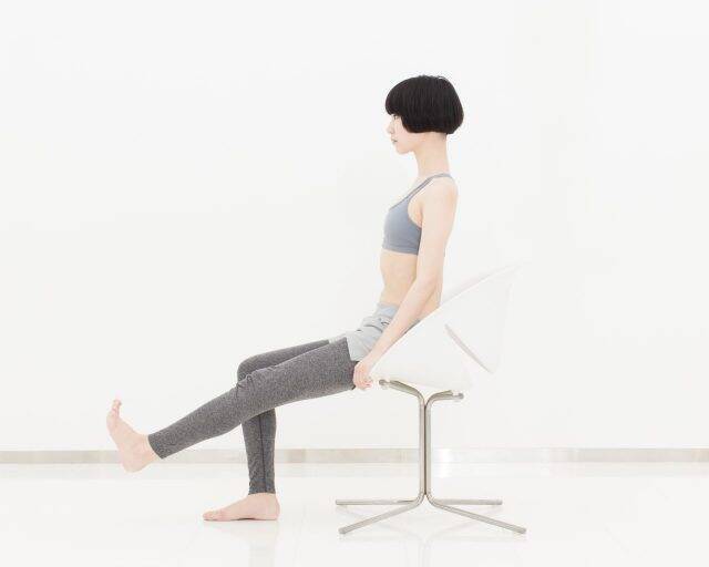 (1)背筋をまっすぐ伸ばして椅子に浅く腰掛け、片脚を前方に伸ばす