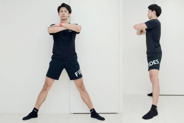 (1)肩幅よりも広めに脚を開き、背中はまっすぐ、胸を開いたまま胸の前で手を組む