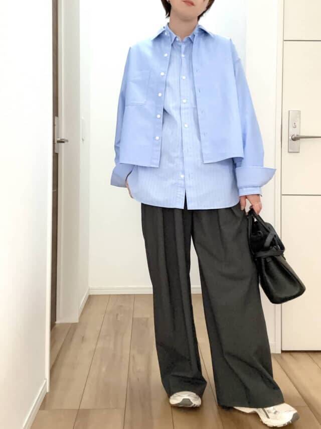 シャツの中でもとくに旬なブルーのストライプ柄の上に、ショート丈シャツをアウター感覚でレイヤード。ブルーのコントラストが爽やかな、一捻りあるシャツコーデが完成できます。安定のグレーのスラックスできちんと感をキープしながら、スニーカーでハズして、キメすぎないのが洒落感を高めるポイントです。