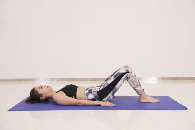 (1)仰向けの姿勢になって両ひざを軽く曲げ、両腕を体側に置いて手のひらは床に着ける