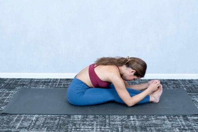 ▲足の親指に手が届かない場合は、手をひざの上に置いて行う形でOKです